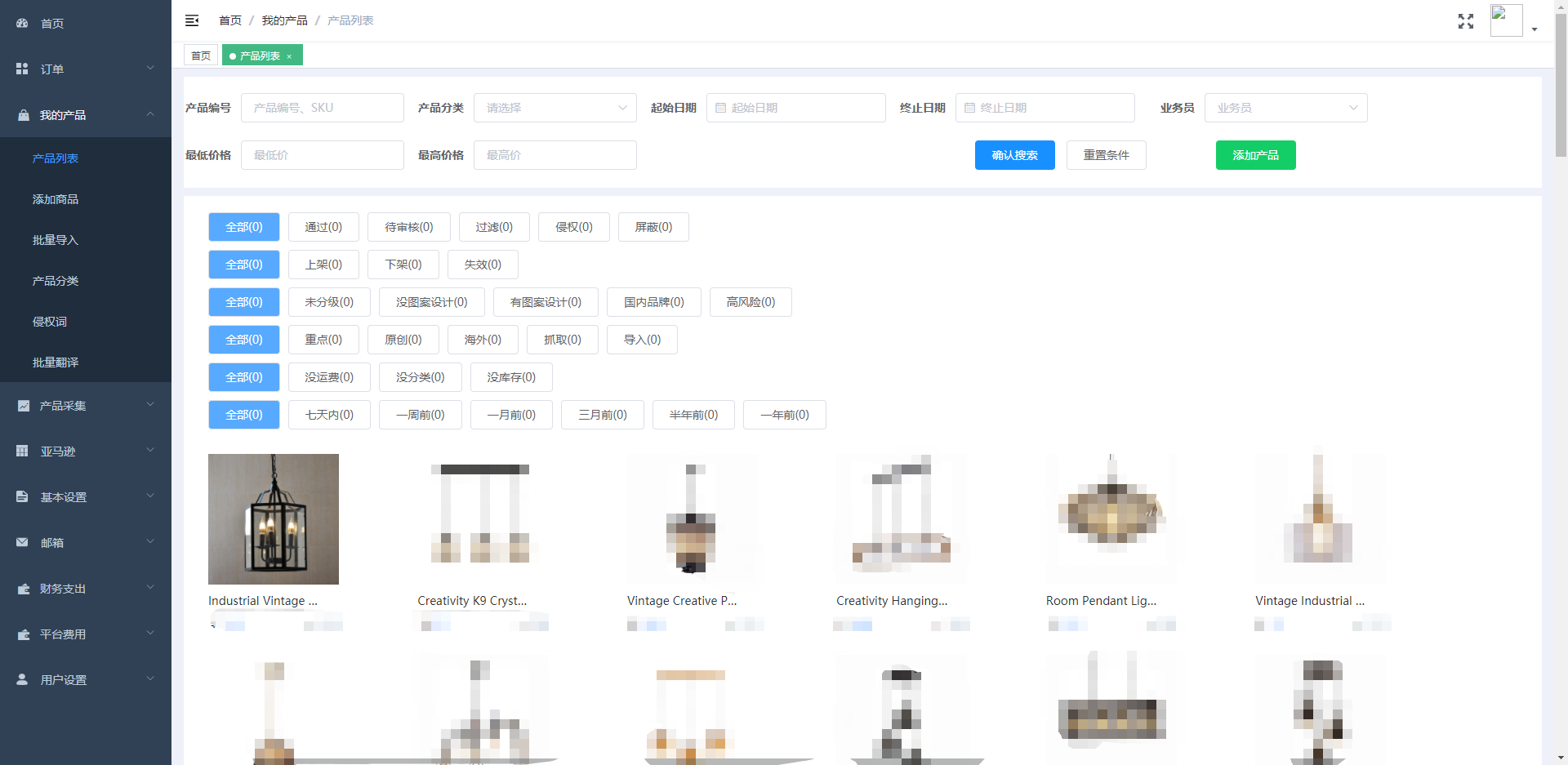 这个模块是我们的产品库,选品后,所有产品信息,库存信息都先存储在这个模块。包括在售产品、未上线的产品、有问题需处理的产品都汇总在这里。