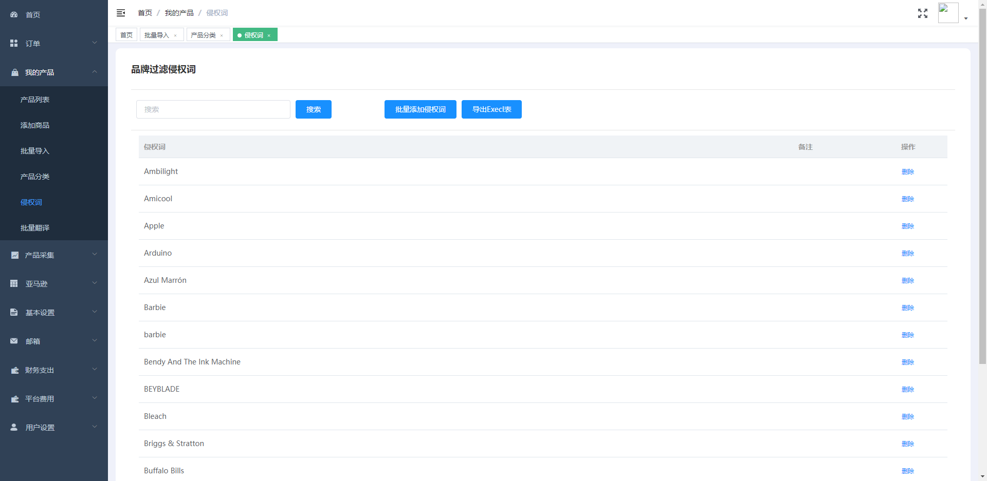 在侵权词库可以批量添加侵权词,在制作Listing及其优化过程中,系统会根据现有的侵权词库进行提醒。所有公司员工都可以对侵权词库进行添加。