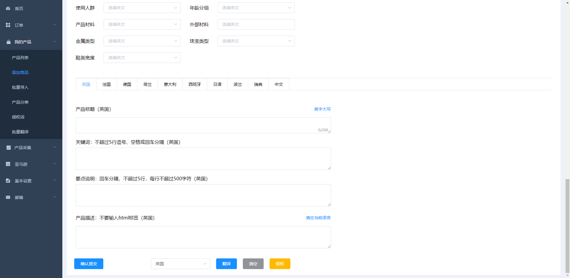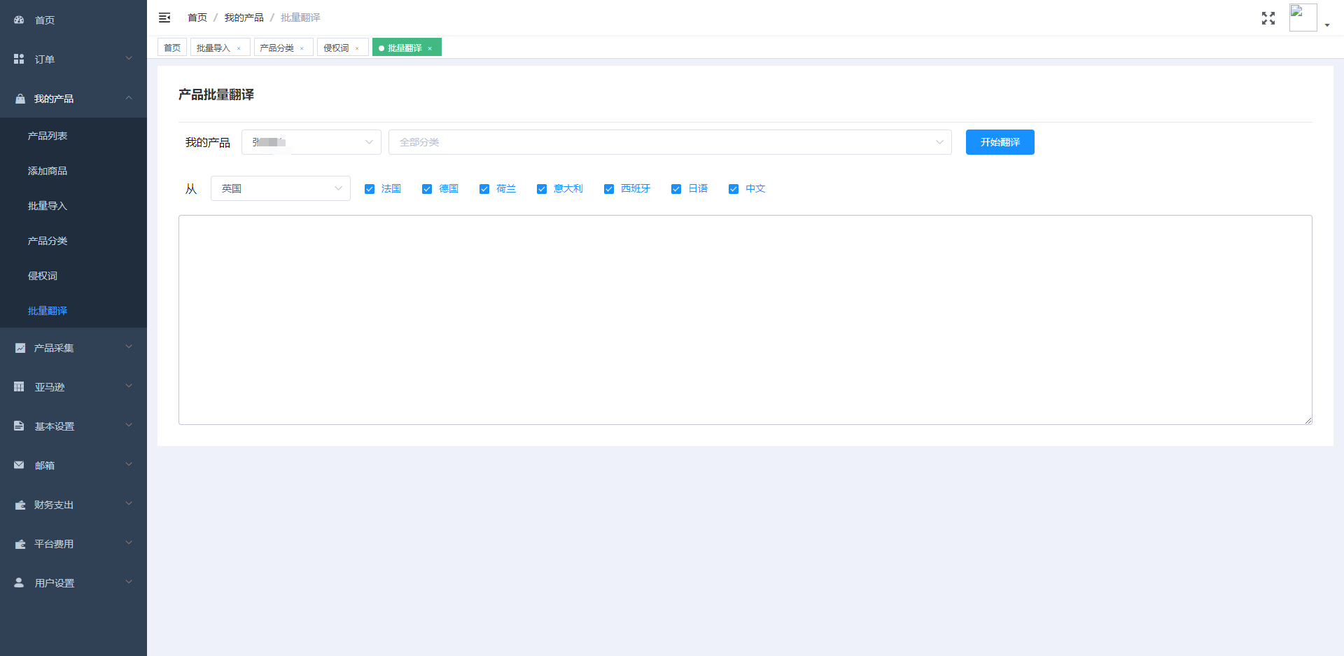 可以在这里对产品的Listing进行多语种的批量翻译,按照业务员和产品分类选出产品。