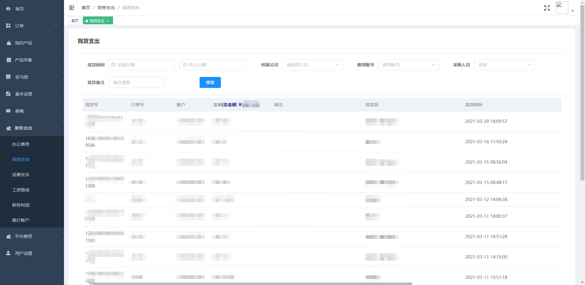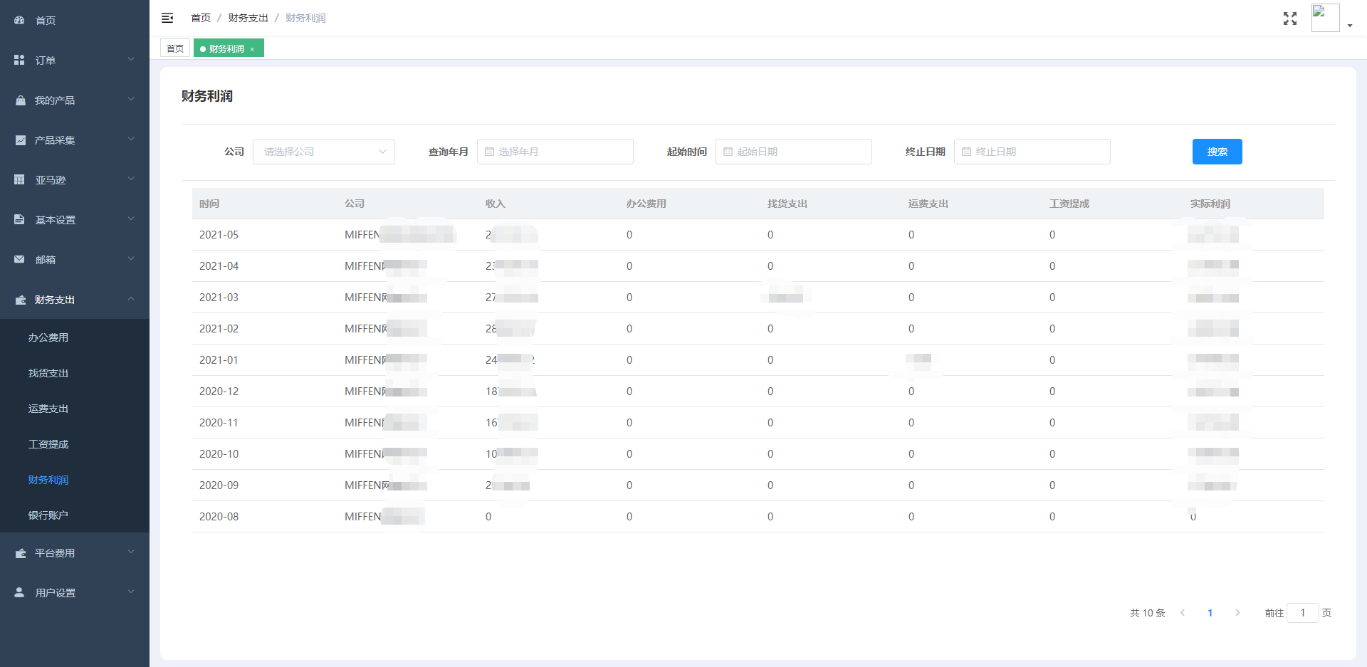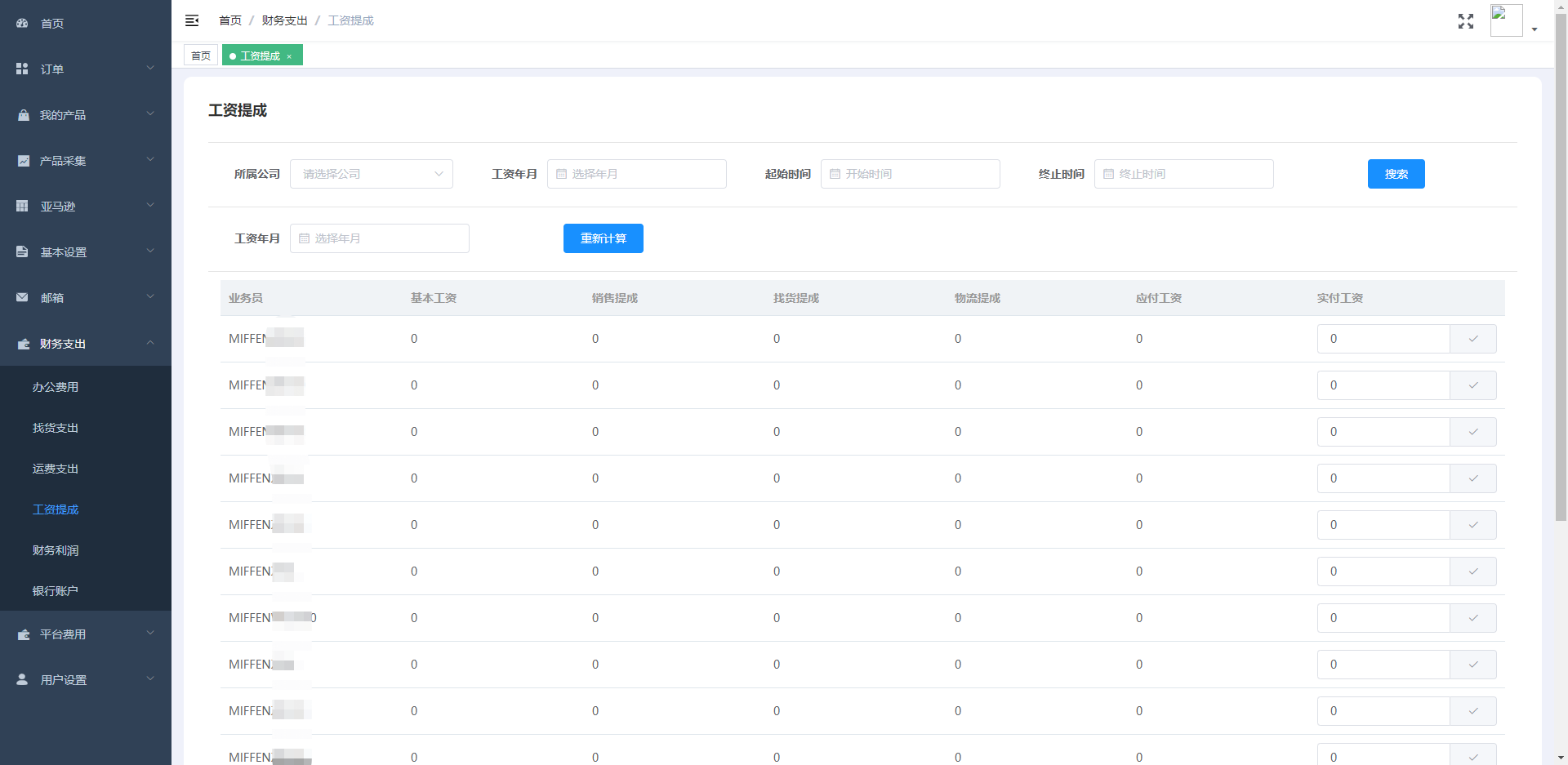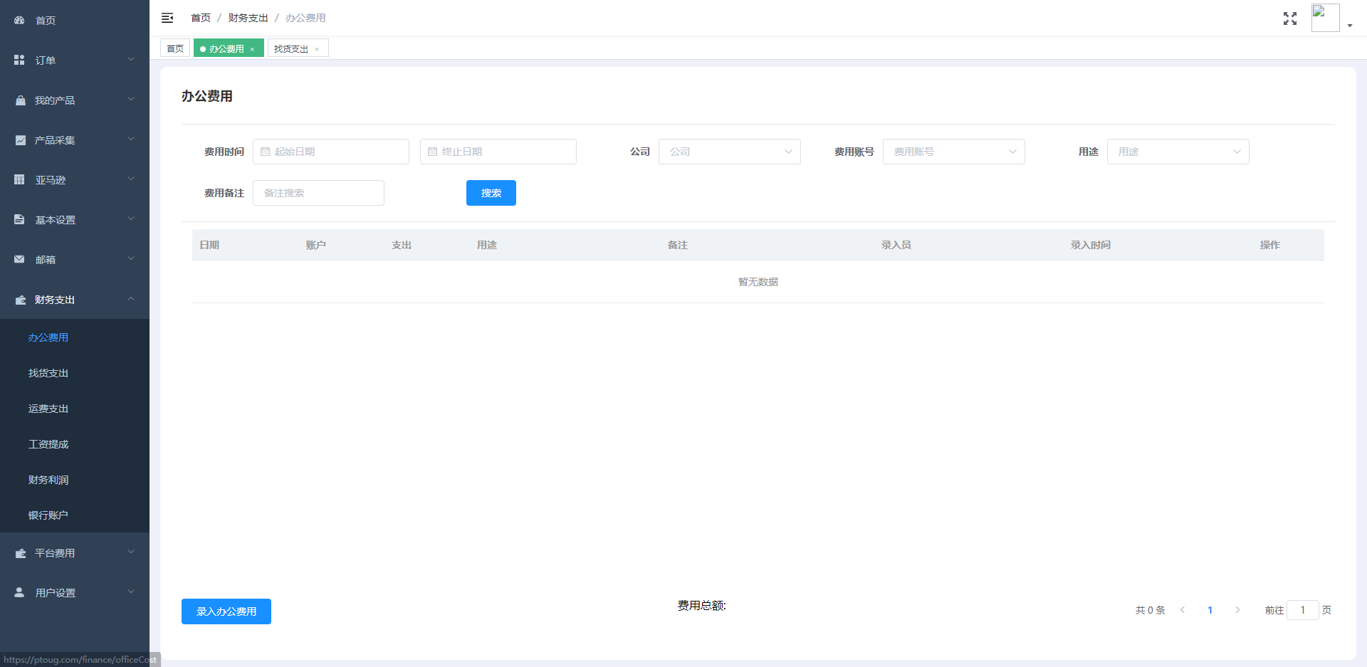 此模块包含办公成本、选品成品、运费成本,业务员提成,财务利润报表,所有费用按照需求可追溯至具体的个人及时间。