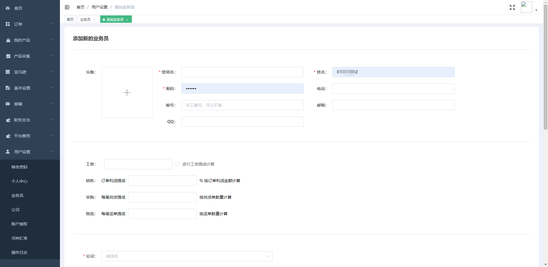 在“添加新的业务员”的同时就可以设置相应的工资及销售、采购等提成。