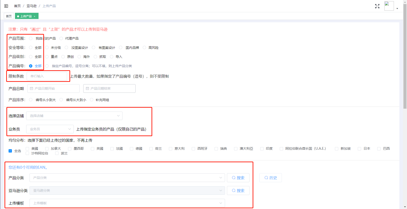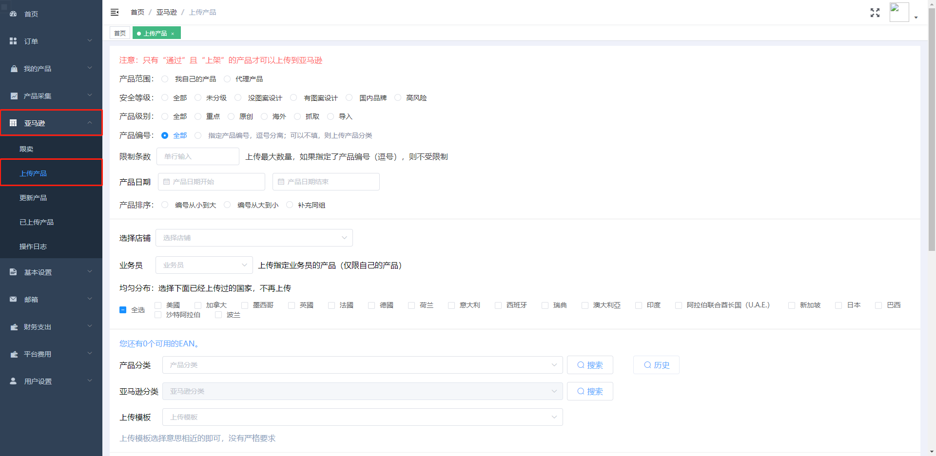 登录到系统后台,打开【亚马逊】->【上传产品】开始进行产品的上传。